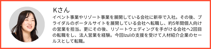 営業スキルをより一層磨きたいという思いから、リゾートウェディングを手がける会社へ、2回目の転職をしました。そこで法人営業として1年と少し経験を積み、今回Izulでの転職活動で人材紹介企業に転職しました。