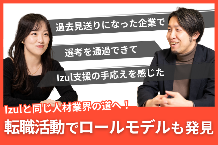その点Izulでは初回面談の段階から、まず「私自身」を理解しようと時間をかけて向き合ってくださいました。その上で、本当に自信を持って合うと考えた企業だけを提案してくれたことが非常に印象に残っています。結果として、それが書類通過率や選考結果にも反映されていたのだと思います。